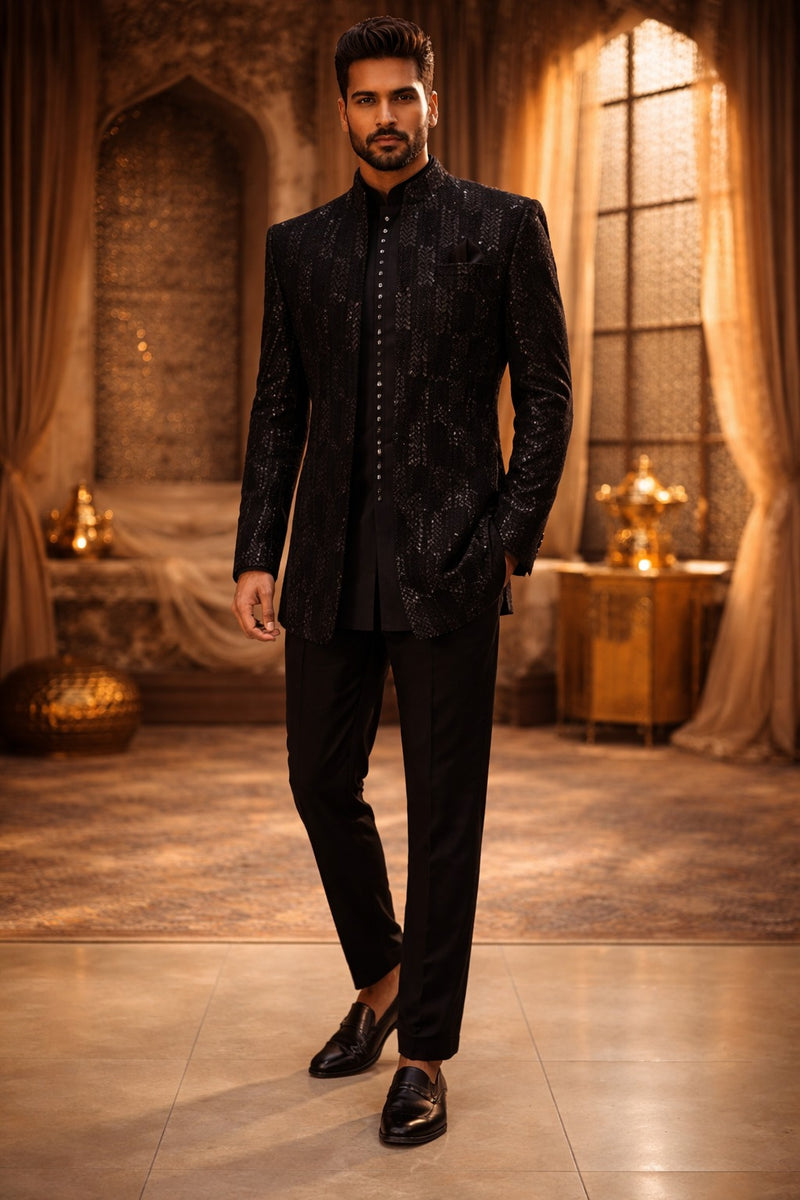 BLUE WITH BLACK ELEGANT SHERWANI AND KURTA WITH TROUSER